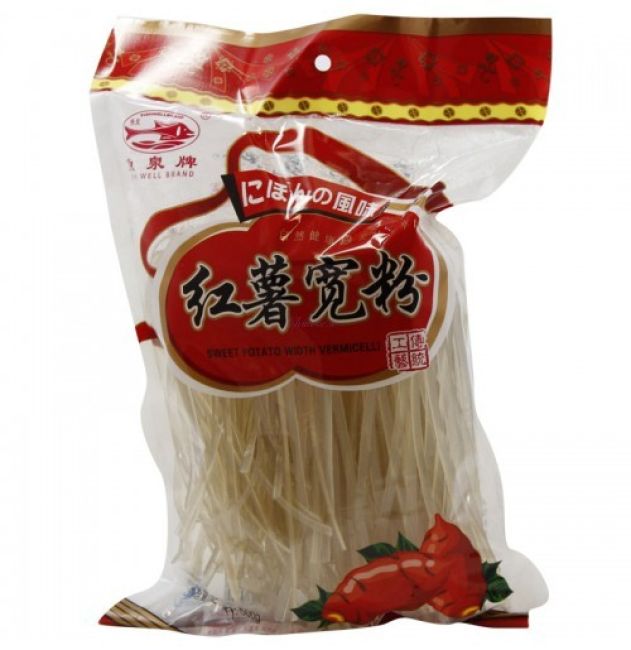 Fish Well Sweet Potato Vermicelli is made from sweet potato starch and water. Sweet potato vermicelli belongs to the glass noodle category. This vermicelli is transparent after cooking and is firmer than the normal rice vermicelli. Due to its texture, it easily absorbs other flavors and is ideal for salads.