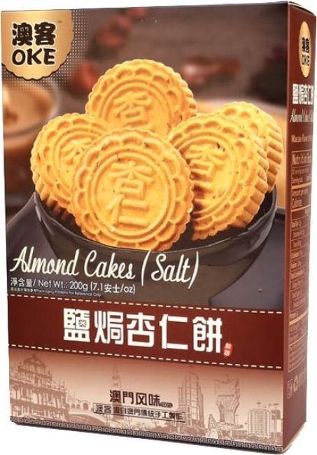 Almond cookies (杏仁餅) are one of the most popular Macau specialty products. These sandy and crunchy cookies are made with ground green bean and they contain almond chips, giving them a nice and nutty aroma. This adaptation of the cookies tastes a tad saltier than the original-flavoured version of the OKE brand. The cookies are beautifully decorated with Chinese characters, making them especially presentable for guests coming over for a nice cup of tea or coffee. The cookies are perfect as an addition to Chinese New Year cookies and as an edible gift.