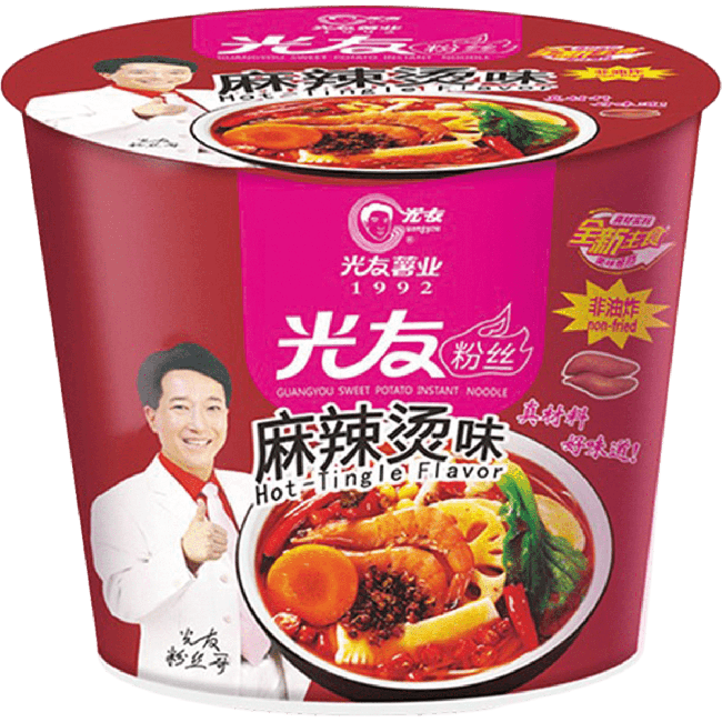 Guangyou kant en klare bowl vermicelli heet en pittig is een kant en klare rijstnoedel met een hete en pittige soepbasis. Het bevat een kruidenmix met verschillende groenten en kruiden om extra smaak aan de bouillon te geven. Dit gerecht is een populaire optie voor een snelle en gemakkelijke maaltijd of snack, en het kan eenvoudig worden bereid door gewoon heet water in de kom te doen en het een paar minuten te laten staan.