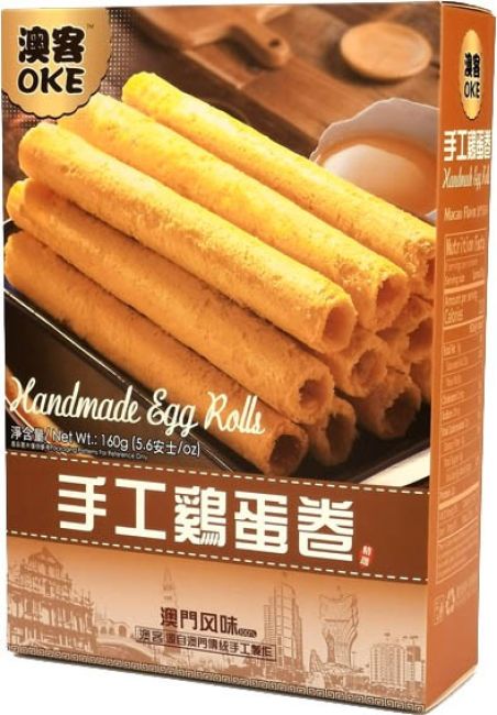 Handgemaakte egg rolls (手工鸡蛋) zijn een van de populairste Macause specialiteiten, tevens de inspiratiebron voor het merk OKE. Deze krokante koekrollen zijn vederlicht, en net als vele andere Chinese lekkernijen zijn ook deze koekjes niet overmatig zoet. Deze egg rolls zijn perfect voor Chinees Nieuw en als geschenk.